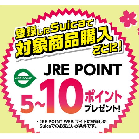 JRE POINT WEB サイトに登録したSuicaで対象商品をご購入いただくと、JRE POINTを5~10ポイントプレゼントいたします。