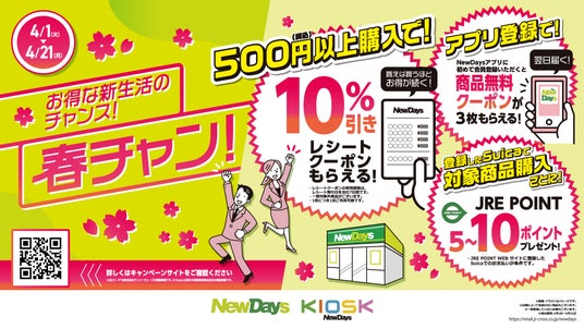 株式会社JR東日本クロスステーション リテールカンパニー(所在地:東京都渋谷区、カンパニー長:高橋 徹)が運営する「NewDays」「NewDays KIOSK」では、4月1日(火)から4月21日(月)まで、春に新生活を迎えるお客さまを応援する「春チャン!」 キャンペーンを実施いたします。新生活は、お得にNewDaysでのお買い物をお楽しみください。