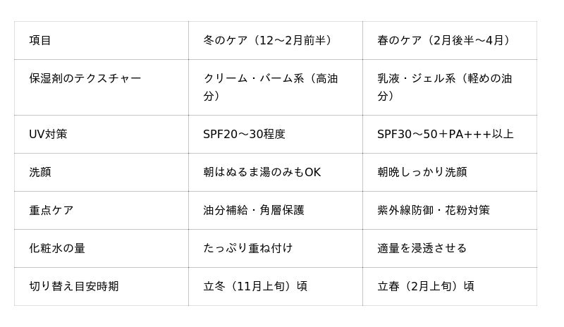 冬のスキンケアと春のスキンケアの比較