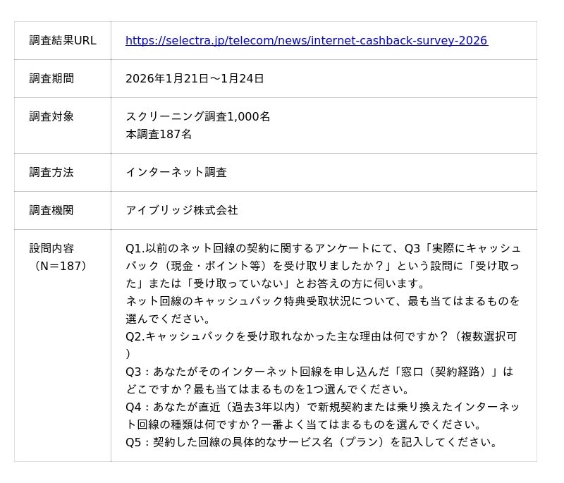 - アンケート調査結果掲載ページとして以下のリンクを設置https://selectra.jp/telecom/news/internet-cashback-survey-2026