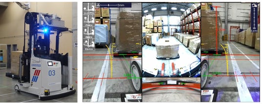 遠隔フォークリフト操作システム検証機(左)と遠隔操作用モニタ画像