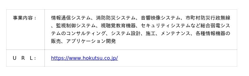 株式会社ほくつうは、1950年の創業以来、情報通信ネットワークや防災情報システムをはじめとする社会インフラ分野において、官公庁・自治体・公共機関向けのシステム構築を手がけてきました。近年では、災害時の情報収集・伝達・可視化を支援する総合防災情報プラットフォームを展開するなど、平時から非常時までを見据えた防災・減災ソリューションを提供し、地域社会の安全・安心を支えています。