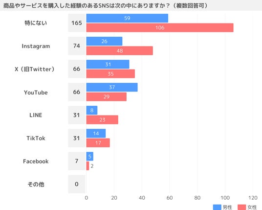 購入経験のあるSNSとして、女性はInstagram、男性はYouTubeが最多となっていますが、これらは前述の「最も頻繁に利用しているSNS」の調査結果で最も回答数が多かったSNSと一致しています。