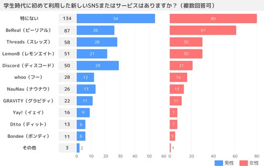 学生時代に初めて利用したSNSとして、BeReal、Threads、Lemon8、Discordがそれぞれ50件以上の回答を得ました。