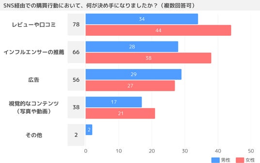 SNS経由での購入における決め手に関する調査では、男女ともに「レビューや口コミ」が最多となりました。