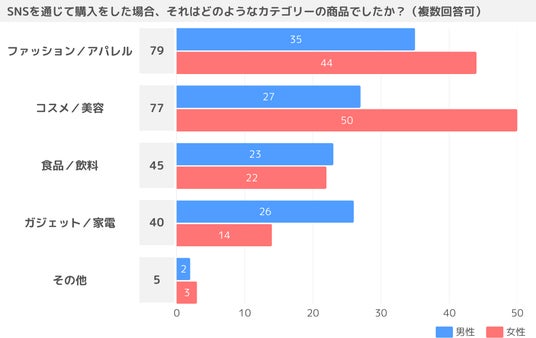 SNS経由で購入するカテゴリーに関する調査では、女性はコスメ/美容、男性はファッション/アパレルが1位となりました。