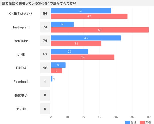 最も頻繁に利用するSNSとして、女性はライフスタイルやファッション、美容などの自己表現の場として人気のInstagram、男性はエンタメや趣味、学習など多岐にわたるジャンルで需要が高いYouTubeが1位となりました。