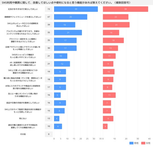 対して、男性は「偽情報やフェイクニュースを減らしてほしい」が2番目に多く、続いて「アルゴリズムが偏りすぎており、多様なコンテンツが見られるようにしてほしい」と「企業アカウントと個人アカウントの違いをもっと明確にしてほしい」が同数で3位となりました。