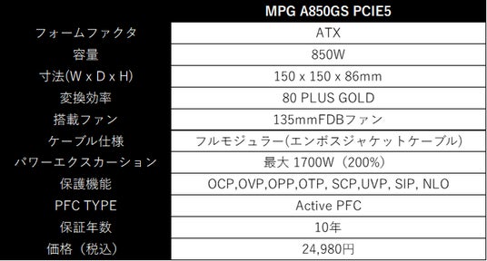 製品URL:https://jp.msi.com/Power-Supply/MPG-A850GS-PCIE5