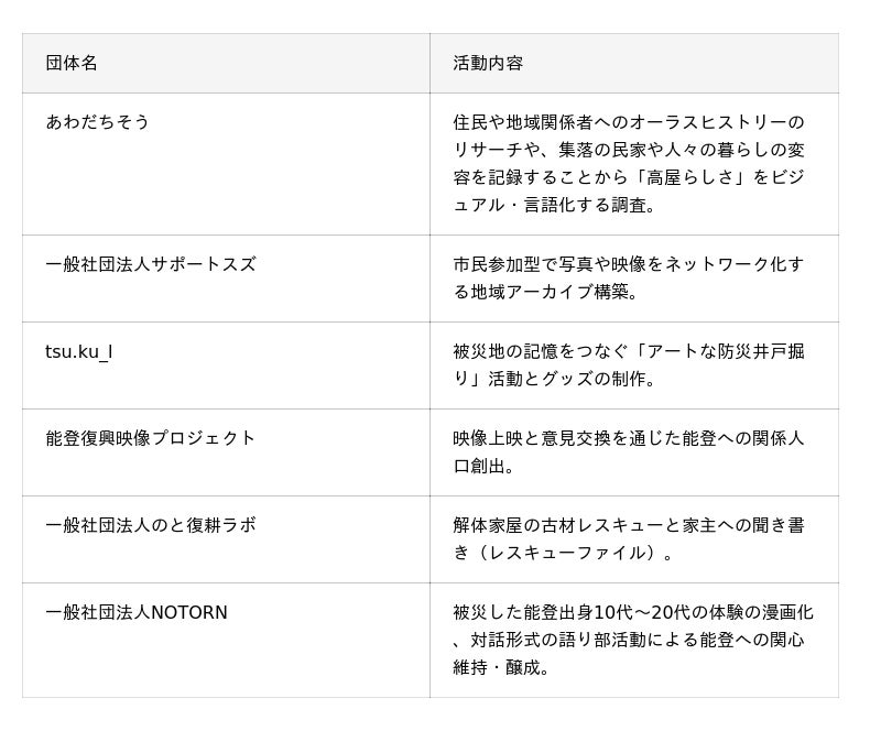 能登の文化、災害の記憶の継承に取り組む6団体からの活動報告と対談を行います。採択団体の活動内容をご取材いただきたく、ご案内いたします。
