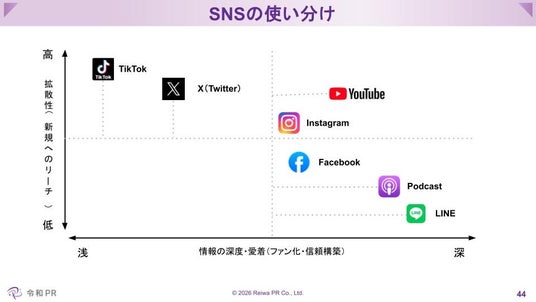 また、TikTok、X、Podcast、LINEなど、SNSの各媒体の特性を活かした「使い分け」や、ユーザーと一緒に盛り上がる「ユーザー生成コンテンツ(UGC)」の重要性についても深く掘り下げました。