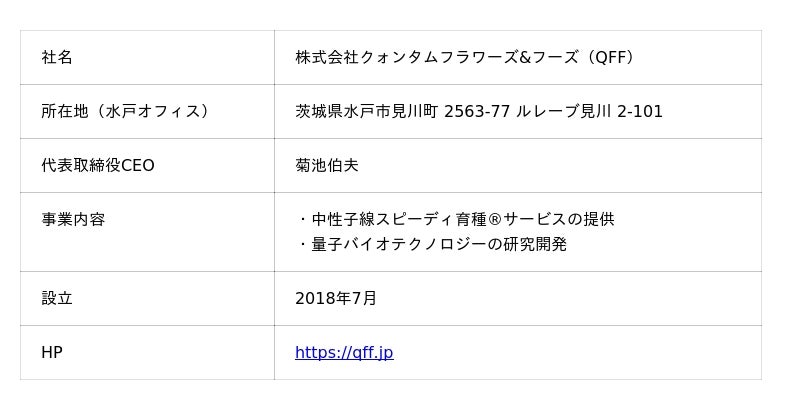 中性子線スピーディ育種(R)を展開する 株式会社クォンタムフラワーズ&フーズ(QFF/本社:茨城県水戸市、代表取締役 CEO:菊池 伯夫)は、2026年2月13日(金)13時~17時にTokyo Innovation Base(東京都千代田区丸の内3-8-3)およびオンライン(Zoomウェビナー)で開催される『令和7年度 未来を創る!フードテックビジネスコンテスト 本選大会』にファイナリストとして登壇することをお知らせいたします。