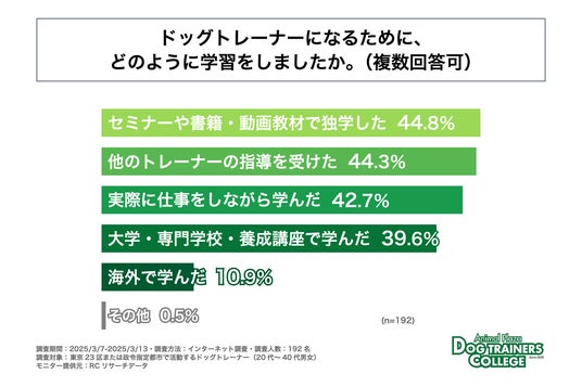 次に「ドッグトレーナーになるために、どのように学習をしたか」を尋ねる設問の回答では、1位が「セミナーや書籍・動画教材で独学した」で44.8%、2位が「他のトレーナーに指導を受けた」で44.3%、3位が「実際に仕事をしながら学んだ」で42.7%、4位が「大学・専門学校・養成講座で学んだ」で39.6%という結果になりました。回答率約40%の回答が複数並ぶ形となり、この結果からドッグトレーナーになるための学習方法は様々あることが明らかになりました。