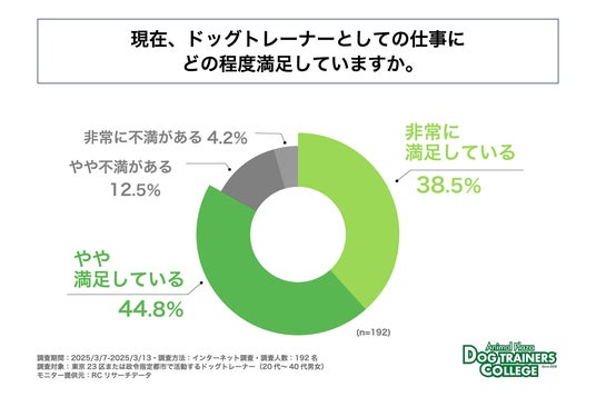 ・正社員、アルバイト・パート、フリーランス・自営業といった仕事の形態を問わず、ドッグトレーナーとして働く人の8割以上が、現在の仕事に満足している