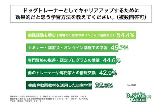調査の最後、前問で「ドッグトレーナー以外の仕事に転職したい」と回答された方以外の方に「ドッグトレーナーとしてキャリアアップするために効果的だと思う学習方法」を尋ねる設問の回答では、1位が「実践経験を積む」で54.4%、2位が「セミナー・講習会・オンライン講座での学習」で45.7%、3位が「専門資格の取得・認定プログラムの受講」で44.6%という結果になりました。また、4位以降も回答率30%を超える回答が複数並ぶ形となり、この結果から、ドッグトレーナーとしてキャリアアップするために効果的な学習方法は多岐に渡ることがわかりました。