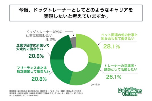アニマルプラザ(本社:東京都渋谷区、代表取締役:加藤 将命)が運営する「DogTrainers College」は、東京23区または政令指定都市で活動するドッグトレーナーを対象に「ドッグトレーナーのキャリア」に関する実態調査を実施しました。この調査結果から、ドックトレーナーとして働く方々のキャリアへの考えなどが明らかになりました。
