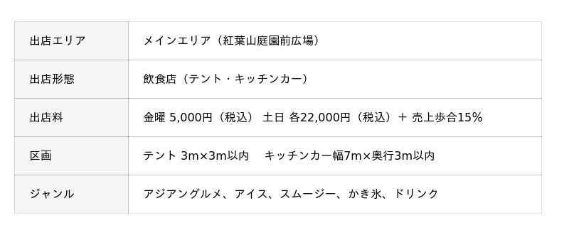 暑い季節に思わず手に取りたくなる、見た目も楽しめる冷たいメニューで、来場者に涼やかなひとときとワクワク感を届けていただけるお店をお待ちしています。定番のアイスやかき氷はもちろん、素材にこだわったメニューや、ここでしか味わえないオリジナルスイーツも歓迎します。