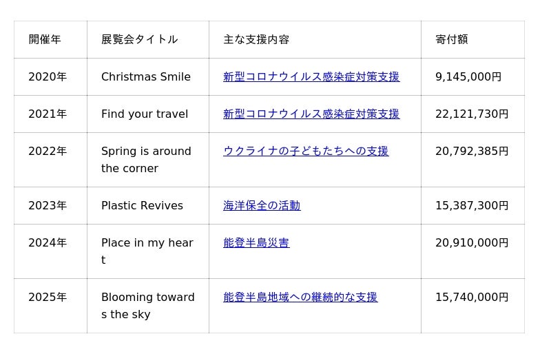 本活動は、2020年のコロナ禍における医療従事者への支援を出発点とし、「アートの力を通じて社会に貢献する」という一貫した姿勢のもと、各年の社会課題※1に寄り添いながら展開してまいりました。活動開始から6年で累計1億円という節目を迎えることができましたのは、本趣旨にご賛同いただき、貴重な作品を制作くださったアーティストの方々、作品を通じて支援の輪に加わってくださった皆さま、そして関係者の方々の温かいご支援の賜物です。これまでのすべてのお力添えに心より感謝申し上げます。