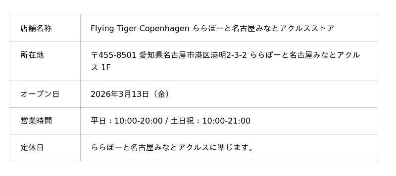 この度フライングタイガーは、 2026年3月13日(金)に、名古屋市の商業施設「三井ショッピングパーク ららぽーと名古屋みなとアクルス」の1階に、愛知県内6店舗目のストアをオープンします。名古屋の中心街からアクセスしやすいロケーションへの出店を通して、近隣のお客様にフライングタイガーらしい楽しいショッピング・エクスペリエンスをご提供していきます。
