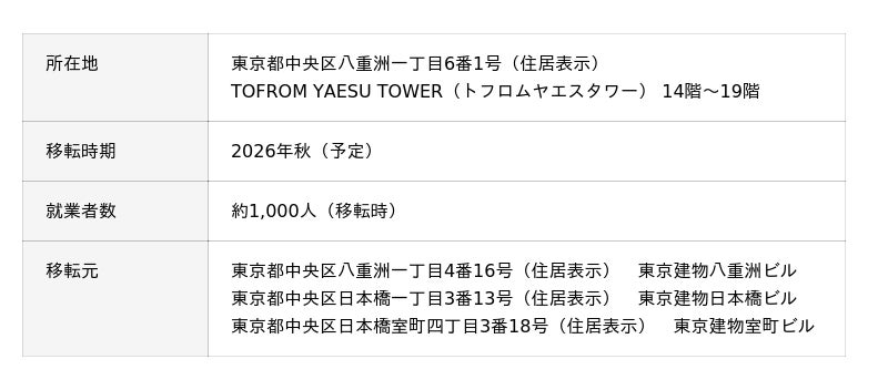 東京建物株式会社 本社機能移転のお知らせ 2026年秋、東京駅前の「TOFROM YAESU TOWER」へ