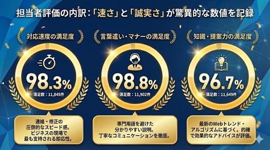 対応速度の満足度:98.3% (満足数:11,845件) 「困った時にすぐ連絡がつく」「修正対応が早い」など、スピード感がビジネスの現場で最も支持されています。