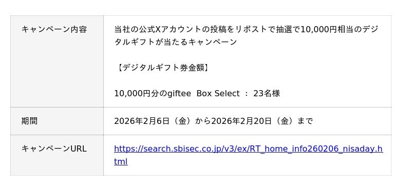 株式会社SBI証券(本社:東京都港区、代表取締役社長:高村正人、以下「当社」)は、2026年2月13日(金)の「NISAの日」に合わせて、当社のXアカウントの投稿をリポストすると1万円分のデジタルギフト券が当たるキャンペーンを実施します。そのほか、「投資情報メディア」で発信しているNISA関連のレポート・コラムなど、NISAデビューに役立つコンテンツを当社WEBサイトにて紹介します。