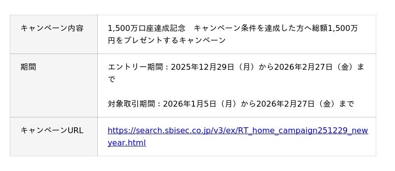 また、当社ではSBIグループ累計1,500万口座の達成を記念して、キャンペーン期間中に投資信託を1万円以上注文・約定した方を対象に最大10万円が当たる「総額1,500万円!新春お年玉キャンペーン」を実施しています。本キャンペーンでは、さらに期間中に国内株式または米国株式の現物買付または新規建(買い・売り)で約定した方を対象に、500万円を山分け(1人あたり上限4,999円)する豪華なキャンペーンとなっています。