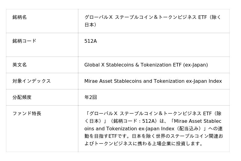Global X Japan株式会社「グローバルX ステーブルコイン&トークンビジネス ETF(除く日本)」(銘柄コード:512A)東京証券取引所より上場承認