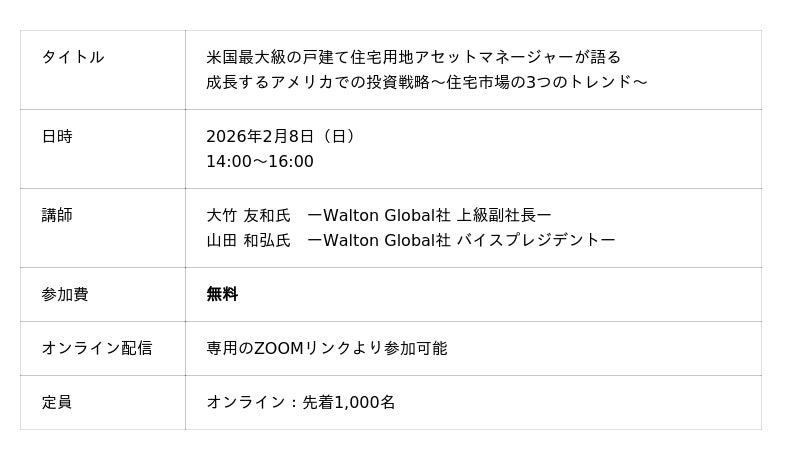 このたび、株式会社クレア・ライフ・パートナーズ(本社:東京都新宿区、代表取締役社長:工藤将太郎)は、米国最大級の住宅用地アセットマネージャーWalton社をお迎えし、米国の在宅市場の動向と投資戦略について徹底解説するセミナーを開催します。