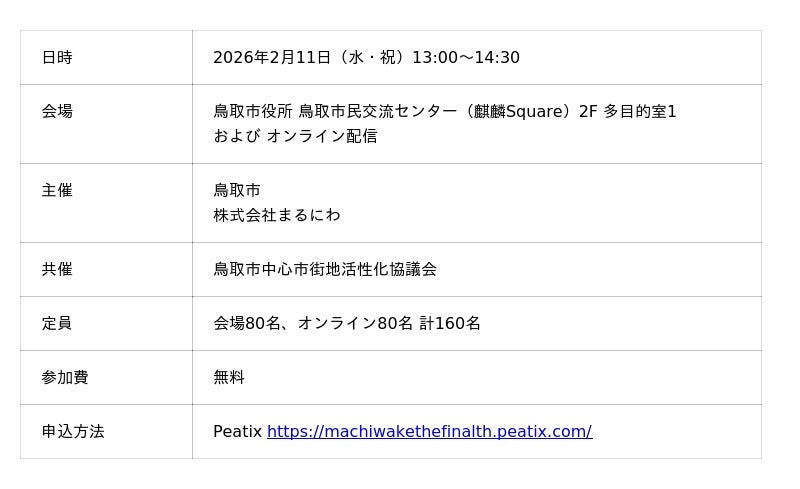 “行動で世の中を変えていく“を理念に掲げる株式会社Dooox(東京都品川区、代表取締役 久保寺亮介/以下「当社」)の営業統括室 室長 浅香豪が、鳥取市(市長:深澤義彦)と株式会社まるにわ(本社:鳥取県鳥取市、代表取締役:齋藤浩文)が主催する「まちづくりワーケーションプログラム@鳥取 the FINAL 最終報告会」(2026年2月11日開催)にコメンテーター(アドバイザー)として参加することをお知らせいたします。本プログラムは、鳥取市中心市街地を舞台に、地元人材と都市部人材が協働して遊休不動産活用プランを立案する官民連携の取り組みで、今回で5回目の開催となります。