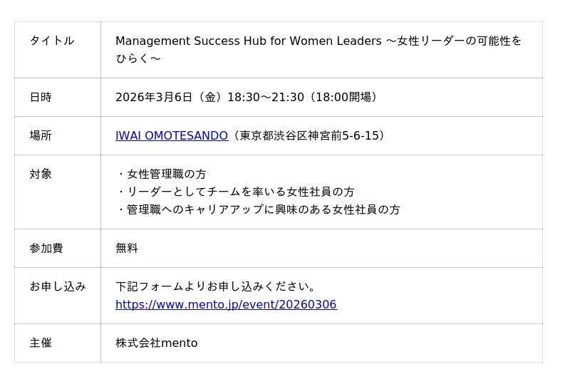 マネジメントサクセスプラットフォーム「mento」を提供する株式会社mento(本社:東京都渋谷区、代表取締役:木村憲仁、以下mento)は、国際女性デーに向けて、2026年3月6日に女性リーダーを対象としたイベント「Management Success Hub for Women Leaders ~女性リーダーの可能性をひらく~」を開催することをお知らせいたします。