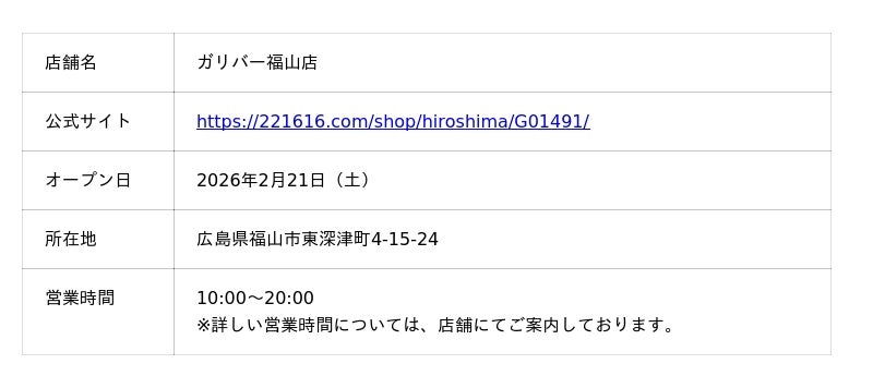 株式会社IDOM(本社:東京都千代田区丸の内二丁目7-2 JPタワー26階、以下:IDOM)はガリバーブランドの新店舗として、2026年2月21日(土)に「ガリバー福山店」(広島県福山市)をオープンいたします。
