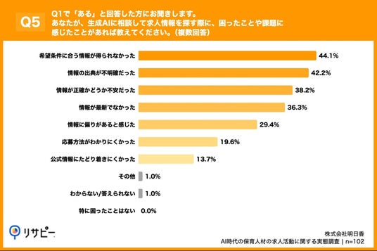 「Q5. Q1で「ある」と回答した方にお聞きします。あなたが、生成AIに相談して求人情報を探す際に、困ったことや課題に感じたことがあれば教えてください。(複数回答)」(n=102)と質問したところ、「希望条件に合う情報が得られなかった」が44.1%、「情報の出典が不明確だった」が42.2%、「情報が正確かどうか不安だった」が38.2%という回答となりました。
