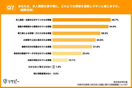 「Q7. あなたは、求人情報を探す際に、どのような情報を信頼しやすいと感じますか。(複数回答)」(n=107)と質問したところ、「求人施設・企業の公式サイトからの情報」が46.7%、「複数の情報源から整理されている情報」が44.9%、「第三者による評価・口コミがある情報」が38.3%という回答となりました。