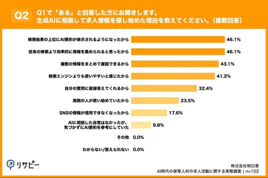 「Q2. Q1で「ある」と回答した方にお聞きします。生成AIに相談して求人情報を探し始めた理由を教えてください。(複数回答)」(n=102)と質問したところ、「検索結果の上位にAI要約が表示されるようになったから」が46.1%、「従来の検索より効率的に情報を集められると思ったから」が46.1%、「複数の情報をまとめて確認できるから」が43.1%という回答となりました。