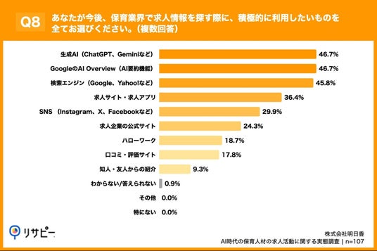 「Q8. あなたが今後、保育業界で求人情報を探す際に、積極的に利用したいものを全てお選びください。(複数回答)」(n=107)と質問したところ、「生成AI(ChatGPT、Geminiなど)」が46.7%、「GoogleのAI Overview(AI要約機能)」が46.7%、「検索エンジン(Google、Yahoo!など)」が45.8%という回答となりました。