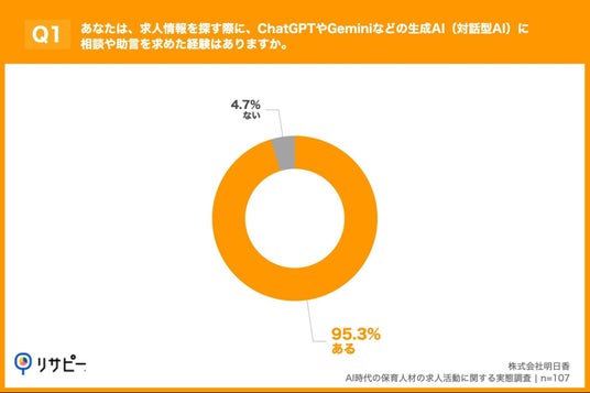 「Q1. あなたは、求人情報を探す際に、ChatGPTやGeminiなどの生成AI(対話型AI)に相談や助言を求めた経験はありますか。」(n=107)と質問したところ、「ある」が95.3%、「ない」が4.7%という回答となりました。