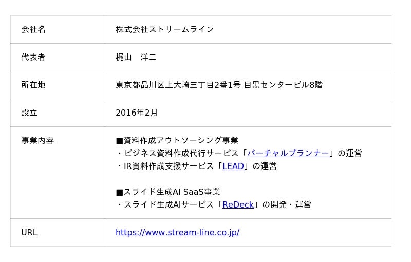 株式会社ストリームラインは「コミュニケーションの合理化で、ビジネスを進化させる」という理念を掲げ、2016年に資料作成代行サービス「バーチャルプランナー」、2021年にIR資料に特化した作成支援サービス「LEAD」の提供をそれぞれスタートしました。創業からパワーポイント資料の作成サービスに特化し、10年間で累計支援社数1,100社を突破。上場企業250社を含む様々な業界の企業様からご依頼をいただき、確かな信頼と多数の実績があるサービスを提供し続けております。