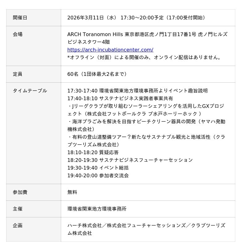 “Publishing a Better Future”をコンセプトに、サステナビリティ領域における専門性・グローバルネットワーク・デジタルメディア運営に強みを持つハーチ株式会社(代表取締役:加藤 佑、本社:東京都港区、以下ハーチ)は、環境省関東地方環境事務所および共同企画者と共に、サステナビリティ領域におけるビジネス創出の可能性を探究する新たな官民ビジネスコミュニティ「KANTO Sustainable Business Network」を立ち上げます。初回のキックオフとなるミートアップイベントを、2026年3月11日(水)に虎ノ門ヒルズビジネスタワー内「ARCH Toranomon Hills」で開催します。