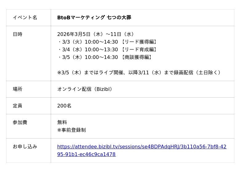 - 商談獲得編:https://attendee.bizibl.tv/sessions/se4BDPAdqHRJ/15083ac5-7984-4a64-aa29-7ac98cc6506f