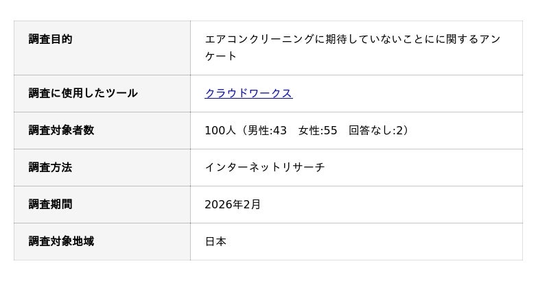 おうちにプロでは、エアコンクリーニングでお悩みの方により有益な情報を提供するために、「エアコンクリーニングに期待していないことにに関する独自調査」を実施しました。アンケート調査の概要は以下の通りです。