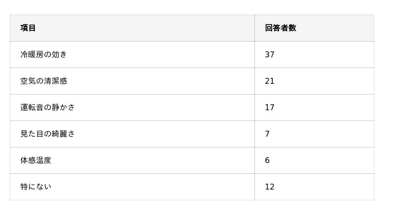 - 逆に期待を超えて良くなったポイントは「冷暖房の効き」「空気の清潔感」。