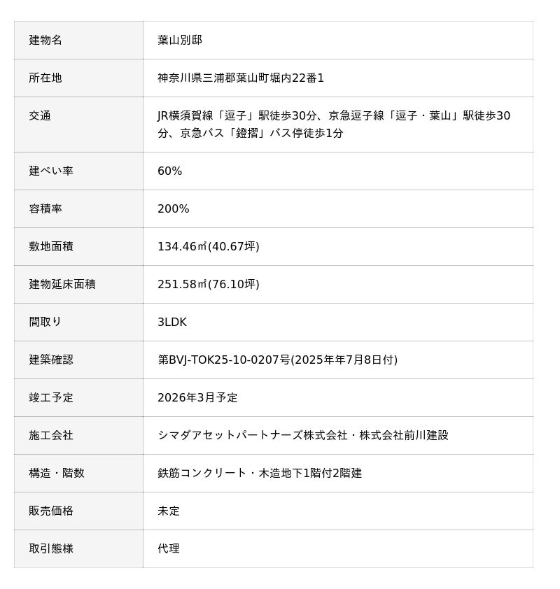 シマダグループ(本社:東京都渋谷区、代表:島田成年)が手がける、海に面したセカンドハウス「葉山別邸」が、2026年3月に完成予定です。本物件の販売は、葉山・逗子・鎌倉エリアで不動産売買仲介・賃貸仲介を行う「うみの不動産」が担当します。