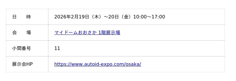 株式会社ビジコム(所在地:東京都新宿区、代表取締役:中馬 浩)は、2026年2月19日(木)~20日(金)の2日間、関西で唯一の自動認識技術&ソリューションの専門展示会である「第22回自動認識総合展 大阪」に初出展いたします。