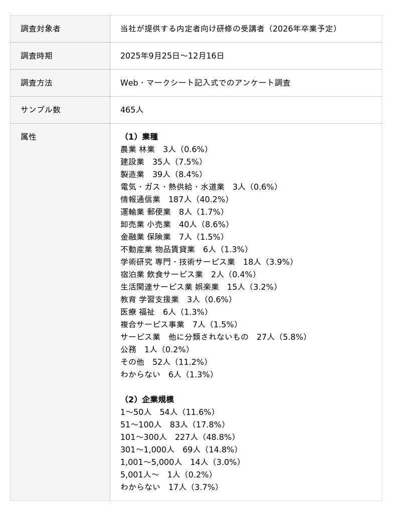 累計20,000社460万人以上の組織開発・人材育成を支援するALL DIFFERENT(オールディファレント)株式会社(所在地:東京都千代田区 代表取締役社長:眞崎大輔)および「人と組織の未来創り(R)」に関する調査・研究を行うラーニングイノベーション総合研究所(R)は、2025年9月25日~12月16日の期間で、2026年入社予定の内定者465人を対象に「内定者意識調査」を行いました。26卒内定者が内定期間に受けたサポートとそれによる意識の変化について調査・分析した結果を公表します。