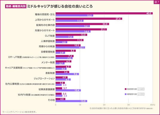 7.自身の成長に役に立った会社の良いところ、勤続意向者は「雰囲気・文化」「上司からのサポート」が高い結果に