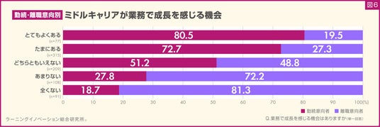 結果、業務で成長を感じる機会(縦軸)が「とてもよくある」と回答した人のうち、80.5%が勤続意向者であることがわかりました。一方、業務で成長を感じる機会が「全くない」と回答した人のうち、81.3%が離職意向者であることがわかりました。成長実感と勤続意向に相関関係があると言えるでしょう。(図6)