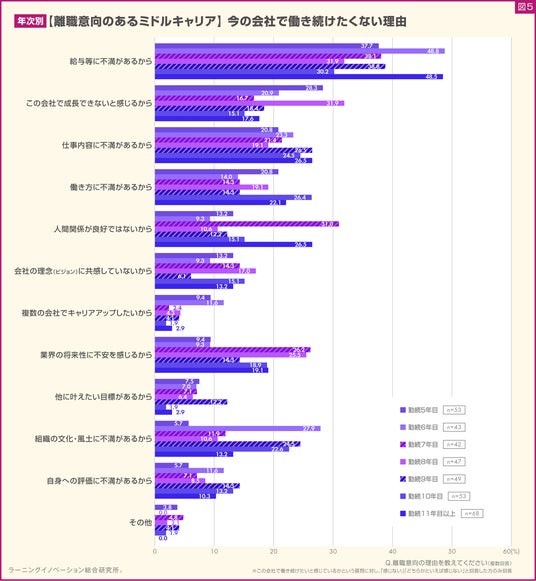 5.今の会社で働き続けたくない理由、「給与等への不満」は全年次共通で最大に。「この会社で成長できない」は、比較的若い年次が回答する結果に
