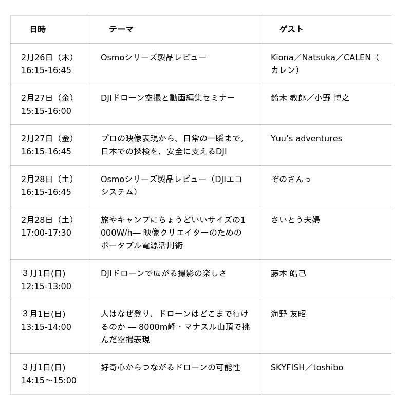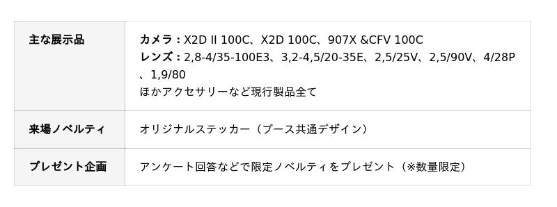 最先端の技術を搭載したDJIドローンの展示をはじめ、最新のアクションカメラやハンドヘルド、圧倒的なディテールと色表現を実現するHASSELBLADのカメラ&レンズ、ユーザーニーズを叶えるプロダクトが人気のPGYTECHのカメラバッグやカメラアクセサリーを、各ブースにてタッチ&トライでご覧いただけます。来場者限定のノベルティやプレゼント企画を実施しますので、ぜひブースにお立ち寄りください!
