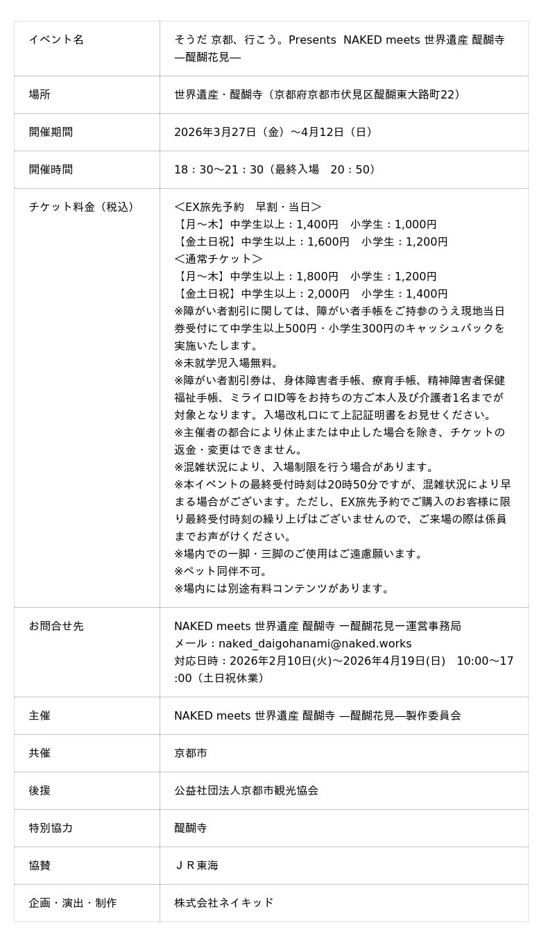 株式会社ネイキッド(英語表記:NAKED, INC. 、所在地:東京都渋谷区、代表:村松亮太郎)は、世界遺産・醍醐寺(京都市伏見区)にて、2026年3月27日(金)~4月12日(日)の期間、『NAKED meets 世界遺産 醍醐寺―醍醐花見―』を開催いたします。本イベントは、JR東海「そうだ 京都、行こう。」との初コラボレーションイベントに抜擢されており、2月10日からEX旅先予約よりチケットをお買い求めいただけます。